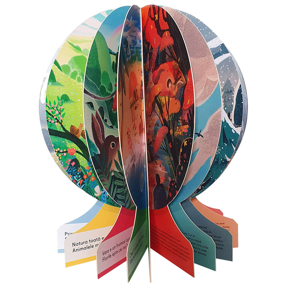 Iar pentru cititorii curioși, în partea dreaptă a paginii găsesc un text secundar ce oferă detalii despre fiecare sezon. Acest omagiu informativ adus anotimpurilor Pământului îl încurajează pe copilul tău să învețe mai multe despre planeta noastră și să se implice în protejarea ei.