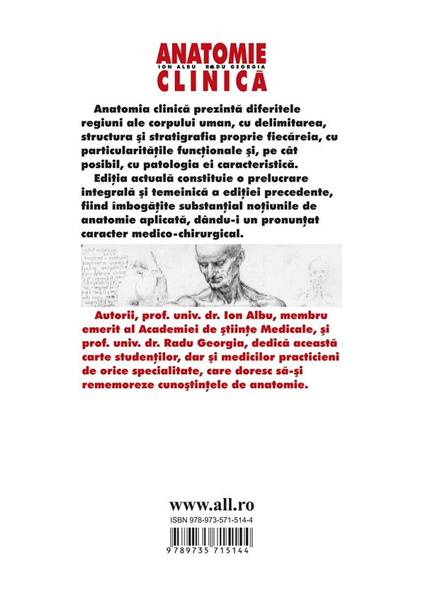 Ion Albu, Radu GeorgiaAnatomia clinică prezintă diferitele regiuni ale corpului uman, cu delimitarea, structura şi stratigrafia proprie fiecăreia, cu particularităţile funcţionale şi, pe cât posibil, cu patologia ei.