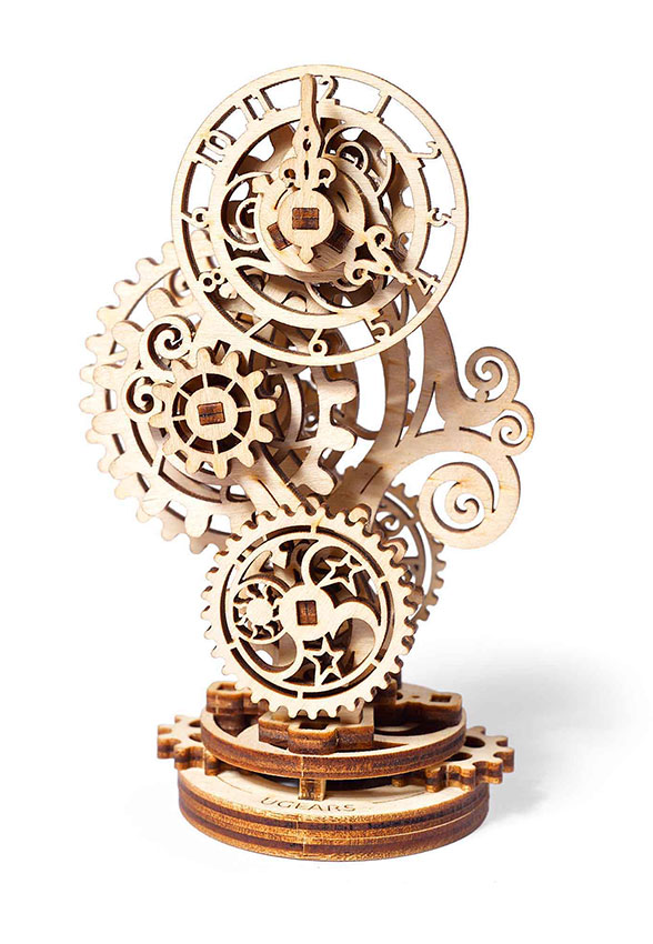 Frumoasa angrenare a modelului include un cuplaj unghiular original de 90 de grade si poti oberva astfel cum functioneaza mecanismul. Alaturi de o conexiune inteligenta pentru angrenaje, designerii si inginerii UGears au implementat o alta caracteristica interesanta: limbile nesincronizare ale ceasului care stau pe aceasi axa. Fiecare dintre acestea se misca in propriul ritm.