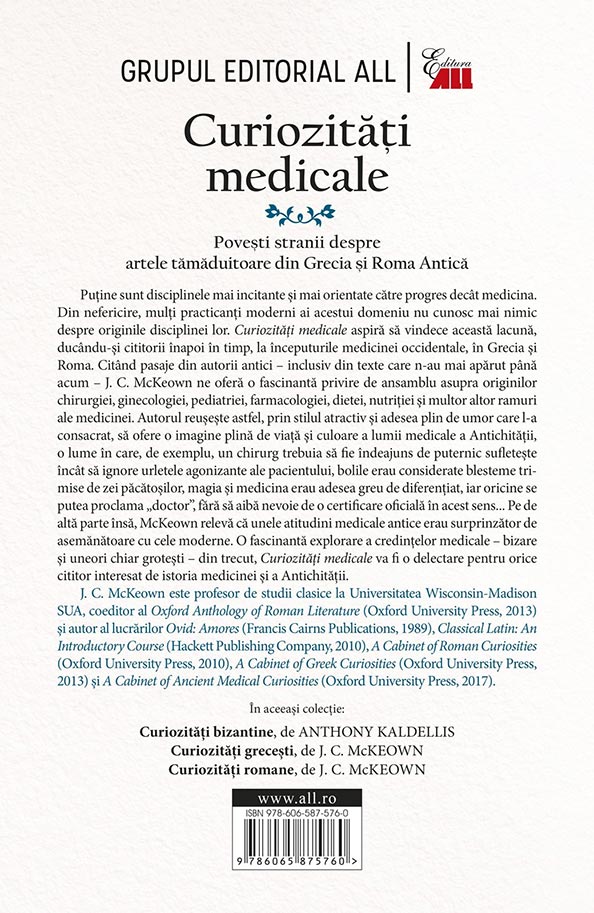 Aceasta nu este o carte de medicină, ci o nouă colecție de aspecte surprinzătoare ale vieții din Antichitate semnată de J.C. McKeown, autorul Curiozităților romane și al celor grecești. Textele antice, unele dintre ele traduse acum în premieră în limbile moderne, reprezintă o sursă de informații savuroase despre teoria și practica chirurgiei, ginecologiei, pediatriei, farmacologiei, dietei și nutriției, dar și despre o serie de alte sfere medicale.