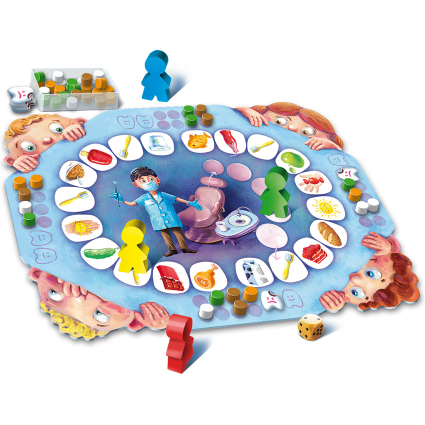 The game is played on a board that shows a circle of teeth. The players move their game figures along the teeth, trying to collect healthy food products and reach the goal. But they must avoid the tempting sweets that lead straight to the dentist’s chair. The goal of the game is to be the first to collect eight game chips of healthy food products, and have no decayed teeth. Learning goals: Make sure always to brush your teeth after eating sweets. Understand the importance of eating healthy and varied food.