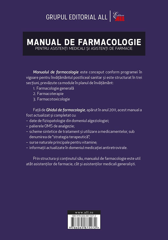Acest manual reprezintă versiunea actualizată a Ghidului de farmacologie și este conceput conform programei în vigoare pentru învăţământul postliceal sanitar.