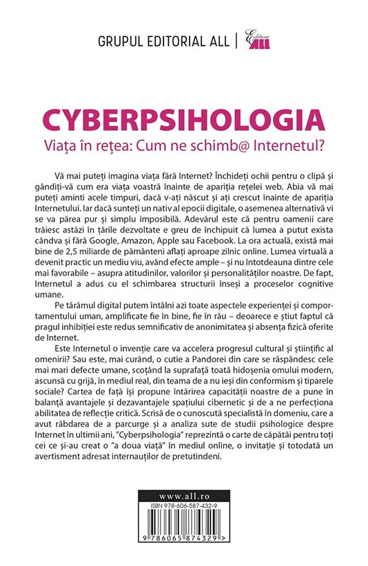 Categoric, pe fondul existenței pe o scenă virtuală s-a format o relație cu totul nouă între noi și propriile noastre acțiuni. În cazul în care trecem în continuu de la viața reală la spațiul cibernetic și înapoi, percepția iluzorie nu poate fi o simplă excepție. Imaginea de ansamblu intră într-o zonă tulbure. Pentru a evita să cădem prea des în capcanele Internetului, trebuie să devenim conștienți de modul în care se răsfrânge permanenta pendulare între viața reală și habitatul virtual asupra identității, emoțiilor și comportamentului nostru. Bazată pe sute de studii psihologice despre Internet și pe noțiuni fundamentale din domeniul psihologiei, cartea ne învață cum să punem în balanță avantajele și dezavantajele spațiului cibernetic. Autoarea ne ajută să descoperim resorturile care ne afectează rațiunea și emoțiile atunci când suntem online. În același timp, ne prezintă și căile prin care putem deveni internauți competenți.