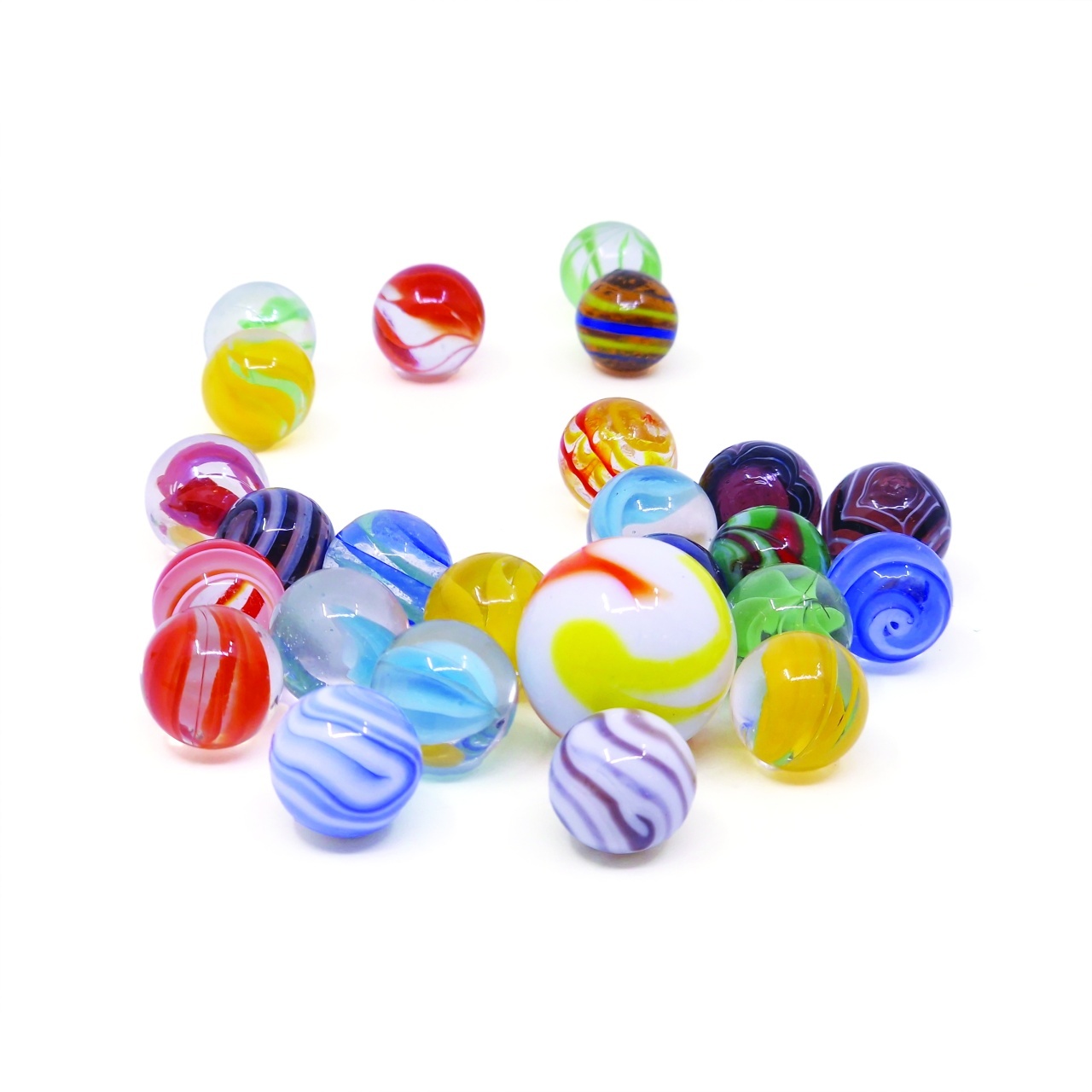 Pachetul include 24 de bile din sticlă de 16mm într-un asortiment aleatoriu vibrant — spirale, culori pline, sclipiri — plus o bilă shooter de 25mm pentru lovituri puternice și precise.