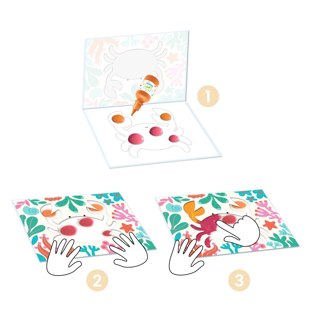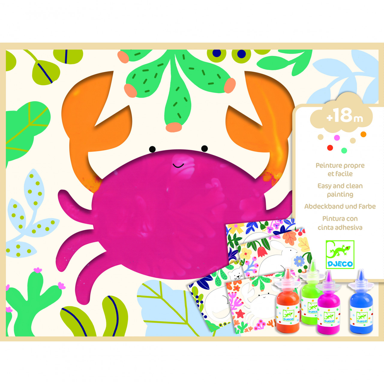 Joc de pictura pentru cei mici Frumos si simplu Un set de pictură pentru începători, fără murdărie. Deschide buzunarul din plastic, stropește puțină vopsea și închideți-l din nou. Apoi, distrează-te împrăștiind vopseaua în timp ce apeși pe buzunar cu degetele pentru a colora animalele fără să te murdărești! După ce copilul a terminat activitatea, clătiți buzunarele cu puțină apă și săpun și poate începe din nou! Copiii învață despre culori și amestecuri. Conținut: 4 mape ilustrate cu buzunar din plastic lavabil, 4 tuburi guașă (roșu, portocaliu, albastru și verde), broșură cu instrucțiuni pas cu pas în imagini. Vârsta recomandată: +18 luni. Fabricat din hârtie și carton certificate FSC®. Conform reglementărilor EN71&ASTM. AVERTISMENT: Se recomandă supravegherea copilului de către un adult în timpul jocului. Citiți cu atenție eticheta produsului înainte de a înmâna jucăria copilului. Producător: Djeco, Franța