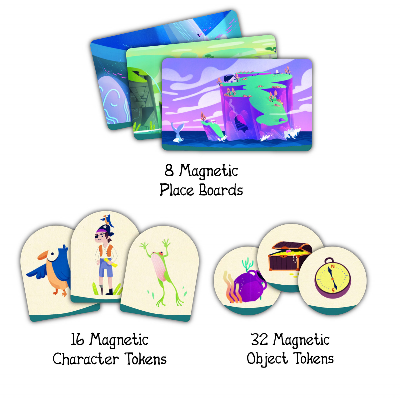 POVESTILE MELE "INTR-O MARE INDEPARTATA - JOC PREMIAT Intră în lumea minunată a creației și narațiunii basmelor cu jocul "SvooryTales"! Acest concept unic este format ca o carte și constă din 3 pagini care corespund structurii de povestire în 3 acte: Configurație, Confruntare și Rezoluție. În pachet sunt incluse multe jetoane magnetice, care trebuie selectate aleatoriu și plasate pe aceste 3 pagini. Pe baza elementelor reprezentate pot fi create diferite tipuri de intrigi și povești cu nenumărate variante alternative! Posibilitățile de povestire sunt infinite! Ideal pentru vârste de peste 3 ani, este un instrument perfect pentru părinți, educatori, consilieri și terapeuți. Extrem de original, realizat din materiale sigure, cu o notă contemporană! Conține 8 jetoane magnetice de loc, 16 jetoane magnetice de personaj și 32 de jetoane magnetice de obiect, depozitate în siguranță în interiorul unor săculeți din bumbac. Este inclus și un marker cu radieră, pentru a scrie și desena pe pagini toate numele, trăsăturile și caracteristicile imaginate. Vârsta recomandată: + 3 ani. Conform standardelor EN71, ASTM, AVERTISMENT! Contraindicat copiilor sub 3 ani. A se folosi sub directa supraveghere a unei persoane adulte. Producător: Svoora, Grecia Manual Joc Povestile mele, Intr-o mare indepartata, Svoora - vezi fisier