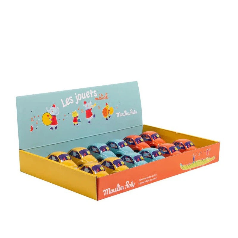 Masinuta metalica rosie Mașinuță colorată, ilustrată cu animale muzicieni veseli. Trage mașina înapoi pentru a o încărca și vezi cât de repede va alerga! Copilul se poate juca singur sau cu prietenii, iar acest joc le dezvoltă abilitățile motorii, fiind în același timp foarte distractiv! Dimensiuni: 8.5 x 4.5 x 4 cm Vârsta recomandată: + 3 ani. Confecţionate din metal (staniu). Conform reglementarilor EN71&ASTM. AVERTISMENT! Contraindicat copiilor sub 3 ani, conţine piese mici, pericol de înghițire. A se folosi sub directa supraveghere a unei persoane adulte. Citiţi cu atenţie eticheta înainte de a înmâna jucăria copilului. Producător: Moulin Roty, Franța.