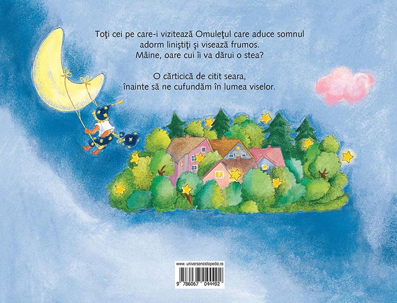 Toţi cei pe care-i vizitează Omuleţul care aduce somnul adorm liniştiţi şi visează frumos. Mâine, oare cui îi va dărui o stea? O cărticică de citit seara, înainte să ne cufundăm în lumea viselor.