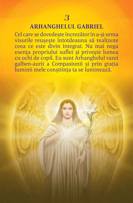 Grație acestui joc divinatoriu, veți putea să vă conectați la raza galben-aurie a Arhanghelului Gabriel, pentru a comunica astfel cu el și pentru a înțelege etapele pe care este necesar să le parcurgeți pentru a vă putea percepe vocea inimii. Arhanghelul Gabriel este aici pentru a vă aduce răspunsul la întrebările voastre, dar mai ales pentru a vă confirma ceea ce simțiți deja. Sunteți înzestrați cu capacități psihice și merită ca, fiind plini de credinţă, să vă deschideți conștiința către Absolut. Pentru a primi mesajele Arhanghelului Gabriel, este nevoie să ne simțim bine ancorați și conștienți de propriul nostru loc pe Pământ. Atunci când extragem lamelele acestui oracol, conform ghidării Arhanghelului Gabriel, toți centrii noștri subtili energetici vor înflori, fiind îmbăiaţi de energia sa sublimă. Arhanghelul Gabriel a știut să găsească cuvintele potrivite pentru a ne oferi cea mai frumoasă învățătură cu privire la iubire. Acesta este un oracol pe care îl putem folosi în fiecare zi, pentru a sorbi din cuvintele acestui minunat Arhanghel. El este prezent pentru a ne îndruma, pas cu pas, pe calea noastră și pentru a ne îmbrățișa cu strălucitoarea sa lumină. Mesajul pe care Gabriel ni-l transmite este un mesaj special. Iată, aici, un pasaj: „Învățăturile mele vă arată calea către forța iubirii și a armoniei relațiilor. Ele vă aduc, de asemenea, diferite instrumente pentru evoluția sufletului vostru. Vă voi arăta cât de necesar este să mergeți înainte conform planului dumnezeiesc ce a fost anume lăsat pentru voi și să nu așteptați acceptul celorlalți pentru a face pași pe cale. Lăsați-vă purtați de iubirea care curge prin fiecare țesut al trupului vostru, prin fiecare celulă, prin fiecare ungher al sufletului vostru. Învățați să ascultați șoaptele Îngerilor.“ Arhanghelul Gabriel ne aduce cunoștințele necesare pentru a merge mai departe în călătoria noastră spirituală, îndrumându-ne astfel să ne îndreptăm spre lumină. El ne învață să simțim starea de compasiune și nu starea de milă, astfel să putem să ne cufundăm în esența propriului suflet. Compasiunea nu este doar un act de prietenie, ci și un mod de a trăi pur și simplu. Compasiunea este necesar să facă parte din viața fiecărei ființe umane. Pentru a putea merge mai departe așa cum se cuvine și pentru a ajunge să înțelegem care este rostul și menirea noastră în această viață, este necesar să acționăm aidoma unor ființe dumnezeiești.