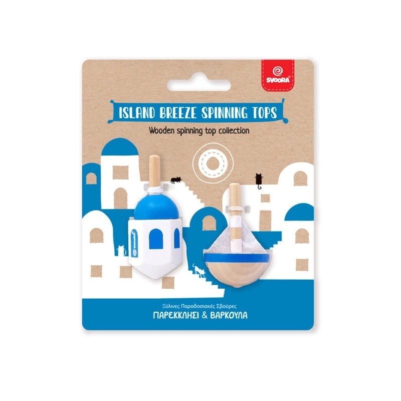 O briză de Grecia în mâna ta! Colecția 'Island Breeze' aduce spiritul inconfundabil al insulelor grecești într-un set de doi titirezi din lemn, fiecare cu un design iconic: Capela și Barca.