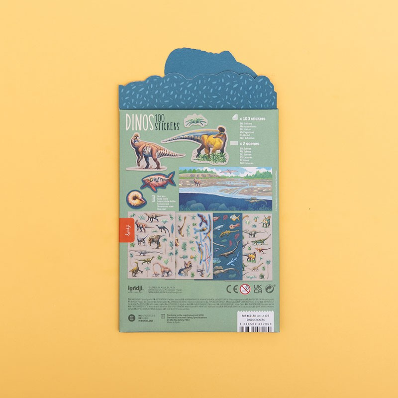 Set cu abțibilduri repoziționabile Dinozauri Setul conține coli cu peste 100 de stickere refolosibile cu diferite specii de dinozauri. Recreează lumea dinozaurilor de câte ori vrei, așa cum dorești. Ilustrație Román García Mora Confecționat din hârtie FSC și carton reciclat. Conform reglementarilor EN71&ASTM. Vârsta recomandată: +3 ani AVERTISMENT: Contraindicat copiilor sub 3 ani. Conține părți mici. Se recomandă supravegherea copilului de către un adult în timpul jocului. Citiți cu atenție eticheta produsului înainte de a înmâna jucăria copilului. Produs în Spania de Londji.
