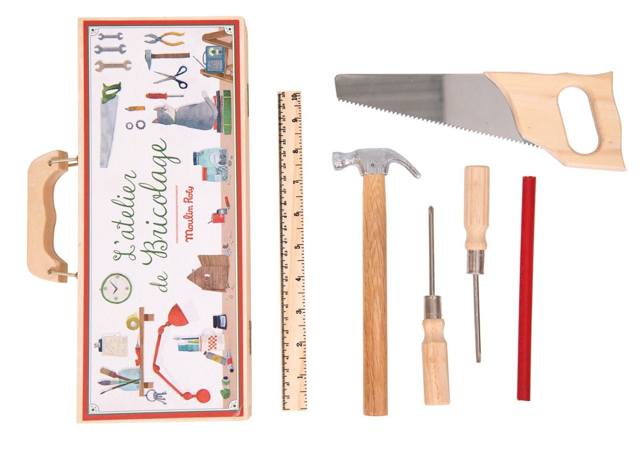 6 unelte reale din lemn masiv și oțel – un fierăstrău, un ciocan, o riglă cu creion și șurubelnițe – sunt adunate ordonat într-o valiză din lemn aspectuoasă, practică și ușor de transportat. Nicio unealtă de plastic, niciun compromis – doar calitate reală, în miniatură.